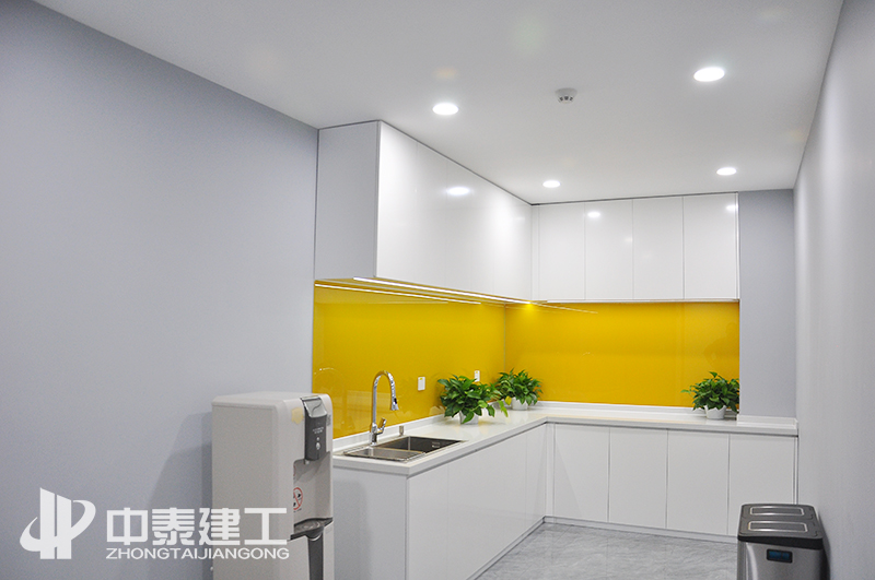茶水間裝修功能性要求比較高,收納充足。明亮的黃色和淡雅的白色形成鮮明的對比,使得空間更加多彩、靈動。